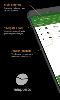Meu Ponto oferece controle total das suas horas trabalhadas. Gerencie múltiplas empresas, configure seu banco de horas e registre o ponto com apenas Um Clique. Desfrute de backup, um layout moderno e relatórios detalhados para uma gestão de tempo eficiente e descomplicada.