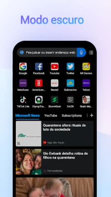 O Navegador Mi transforma-se também em um centro de gerenciamento inteligente para seus arquivos digitais. Organize vídeos, áudios e imagens armazenados em seu dispositivo com facilidade. Para sua tranquilidade, é possível criar uma pasta privada, garantindo que seus itens mais pessoais permaneçam acessíveis apenas por você. Expanda seus horizontes com o recurso de tradução instantânea: navegue por conteúdos em outros idiomas e traduza palavras com um toque, uma funcionalidade valiosa para usuários na Índia, Indonésia e Rússia. E para uma experiência visual envolvente em qualquer hora, ative o Modo Escuro, que proporciona conforto e imersão.